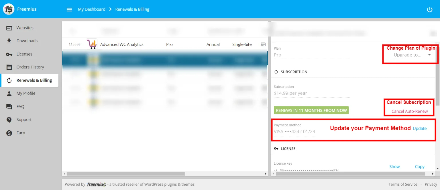Once you logged in your freemius account click menu link named as Renewals and Billings. Once you click on link you will be have different renewals information will be displayed and you can perform action such like changing current plan of plugin, cancel current subscription, updating payment methods and others as shown in below in screenshot.